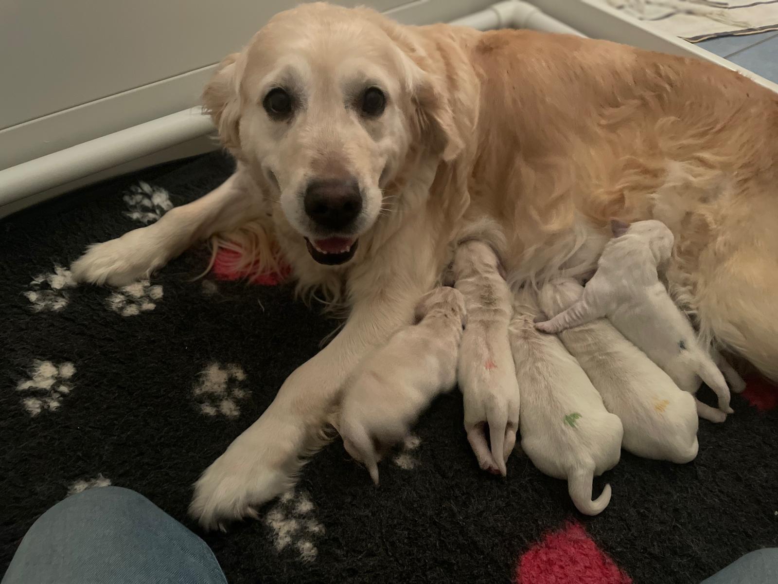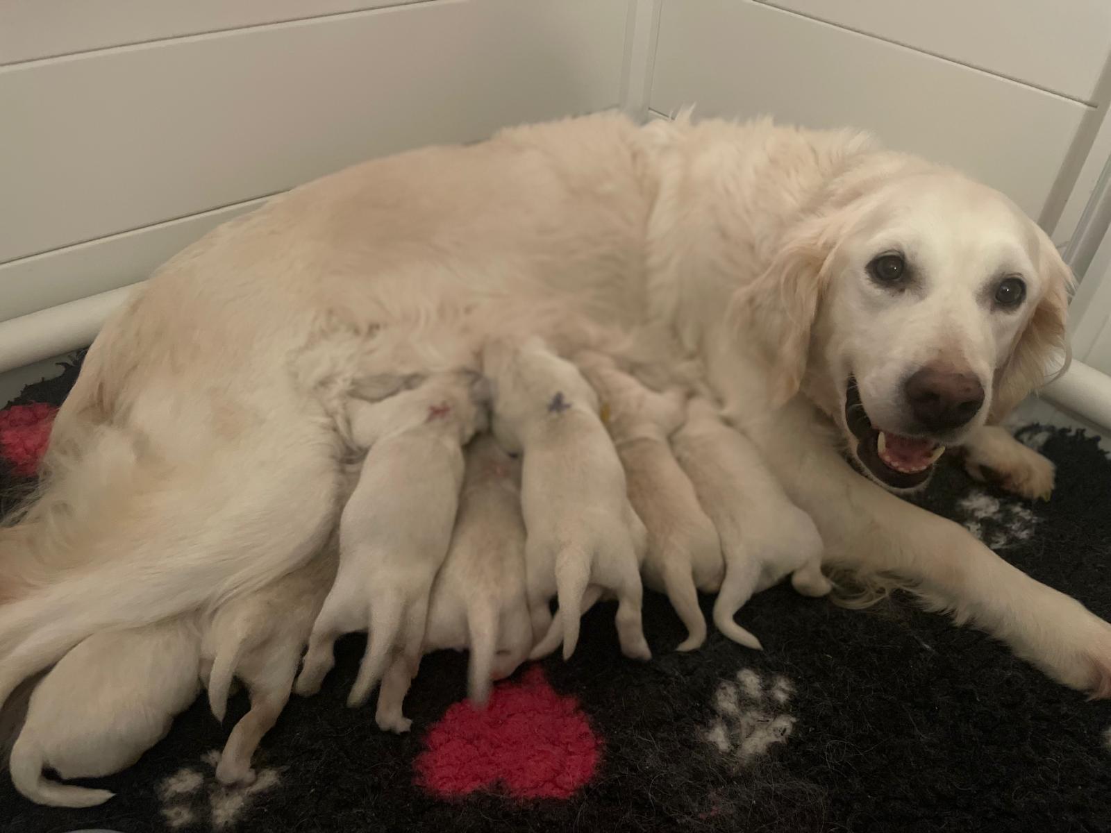 Unsere Frieda hat ihre Welpen bekommen. 9 kleine süße Golden Retriever haben das Licht der Welt erblickt. Aufgeteilt in 4 Rüden und 5 Hündinnen.